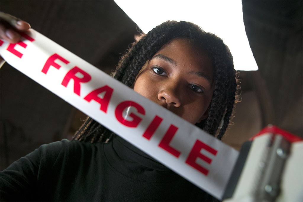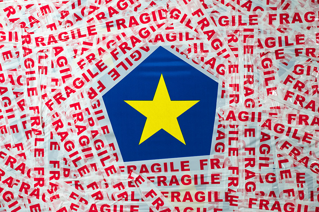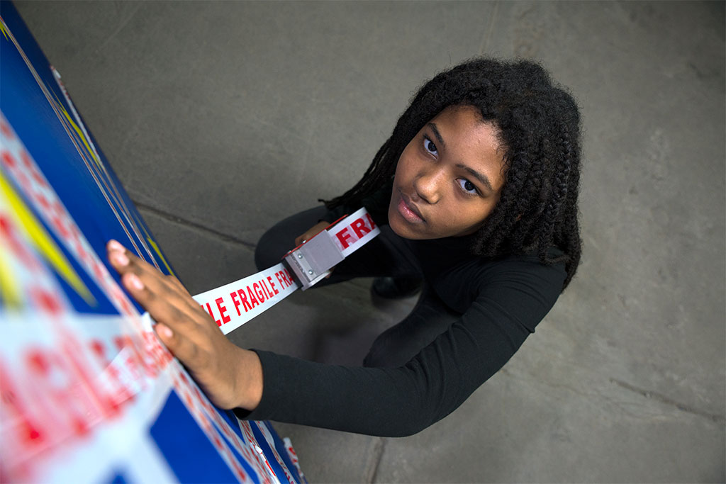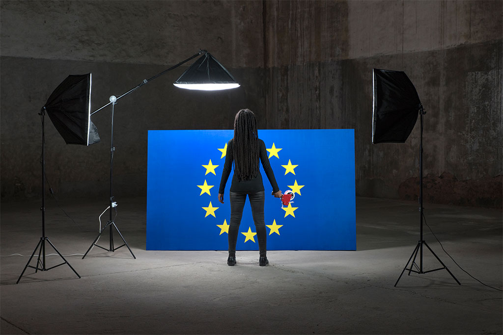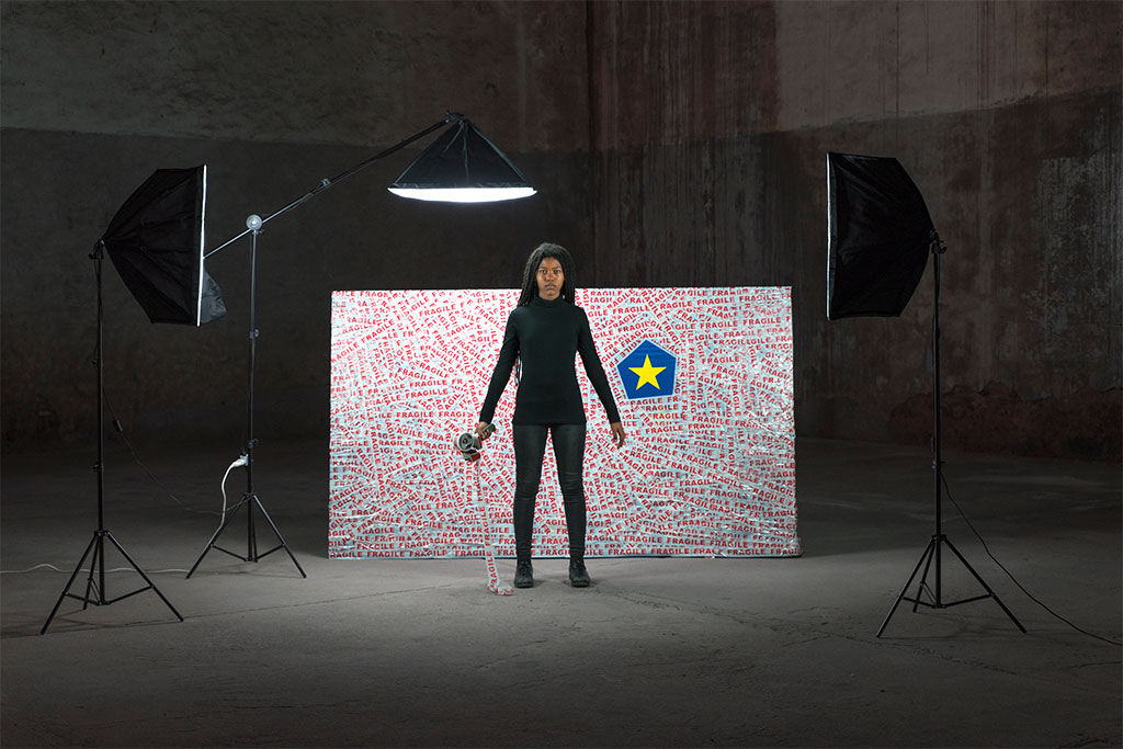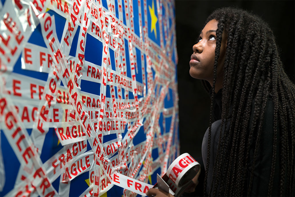Il nastro ‘fragile’, con cui una giovane etiope imballa la bandiera europea, è qui impiegato per tenere assieme e per proteggere gli elementi che costituiscono una comunità talvolta minata nella propria unità e stabilità. L’unica stella che rimane visibile rappresenta l’àncora di salvezza a cui la piccola Sami si è aggrappata per cominciare una nuova vita.