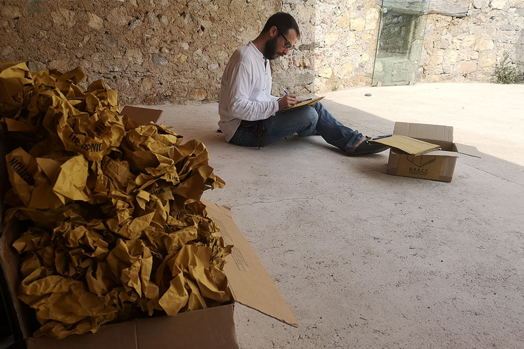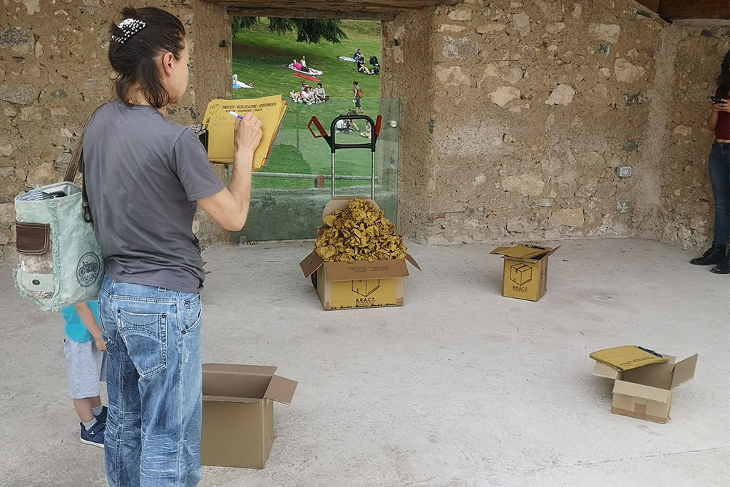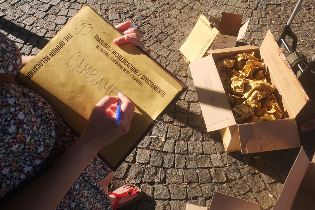 L’opera “The opinion relocation” è realizzata, tramite una serie di attività performative, dall’artista che, servendosi di un carrello porta pacchi, va in giro per le strade di diverse città, portando con sé diversi fogli di carta pacco e chiedendo ai passanti di scrivere delle considerazioni personali (pur mantenendo l’anonimato) sul TRASLOCO e il RICOLLOCAMENTO.